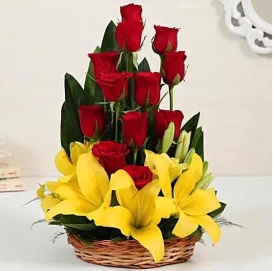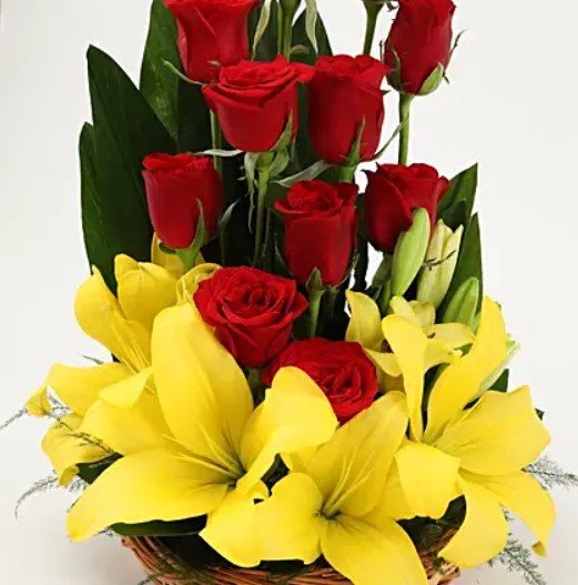 Lilies & Red Roses Basket Arrangement